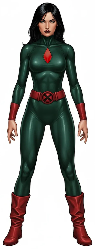 Uniform: A dark green leather bodysuit with a red diamond on the chest, red bracers, red boots, and a red belt with a red and black circle-X on the buckle. As a student of the Xavier Institute, she trained while wearing the black bodysuit with red and black circle-X shoulder pads, yellow boots, and yellow belt with a rectangular red buckle styled with a black X that are standard issue to students.